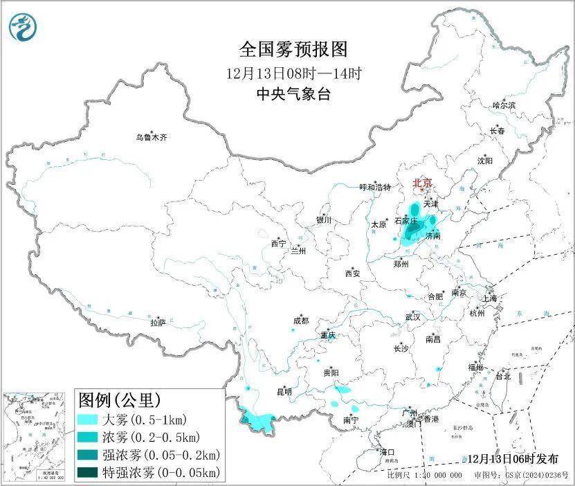 预计,13日早晨至上午,河北中南部、山东西部、河南北部、云南南部、广西西部等地的部分地区有大雾天气,其中河北中南部、山东西北部等地的部分地区有能见度不足500米的浓雾,局地有能见度不足200米的强浓雾。